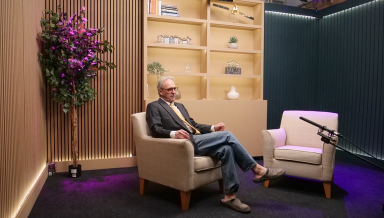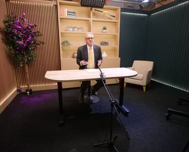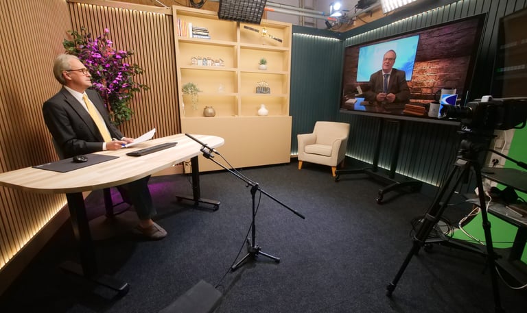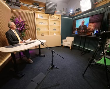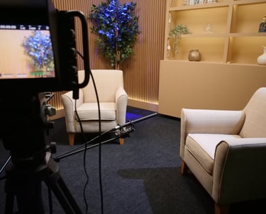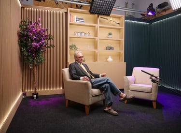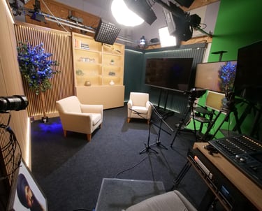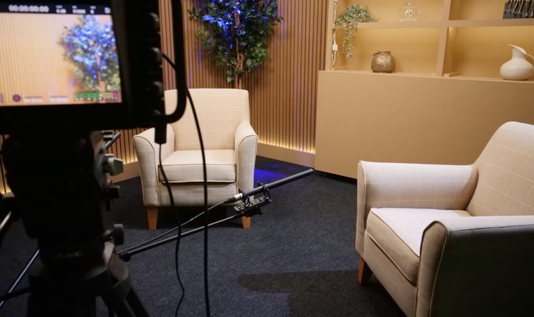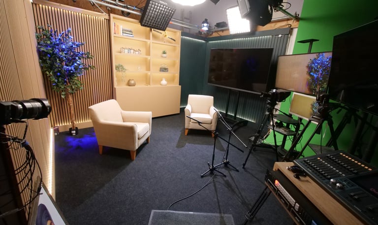 The set also offers the ability to record interviews with remote guests via 75" screen with armchair or studio-style desk available for the host/interviewer. Interviews can be conducted via Zoom, Teams, Riverside FM or other platforms as required and can incorporate screen-shares with 'picture in picture' editing.