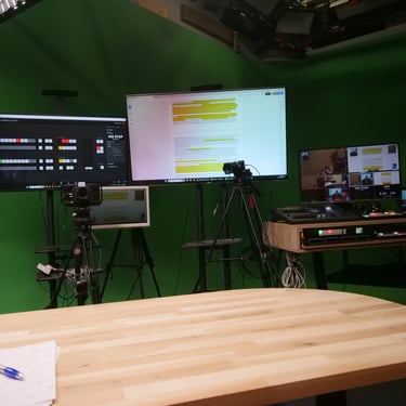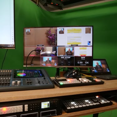 Yes, we have online switchers to change views between speakers as well as capability to add real-time graphics including 'screenshares' with picture-in-picture. The studio has large TV screens behind the cameras so you can view information, questions/comments from your audience as well as teleprompted scripts.